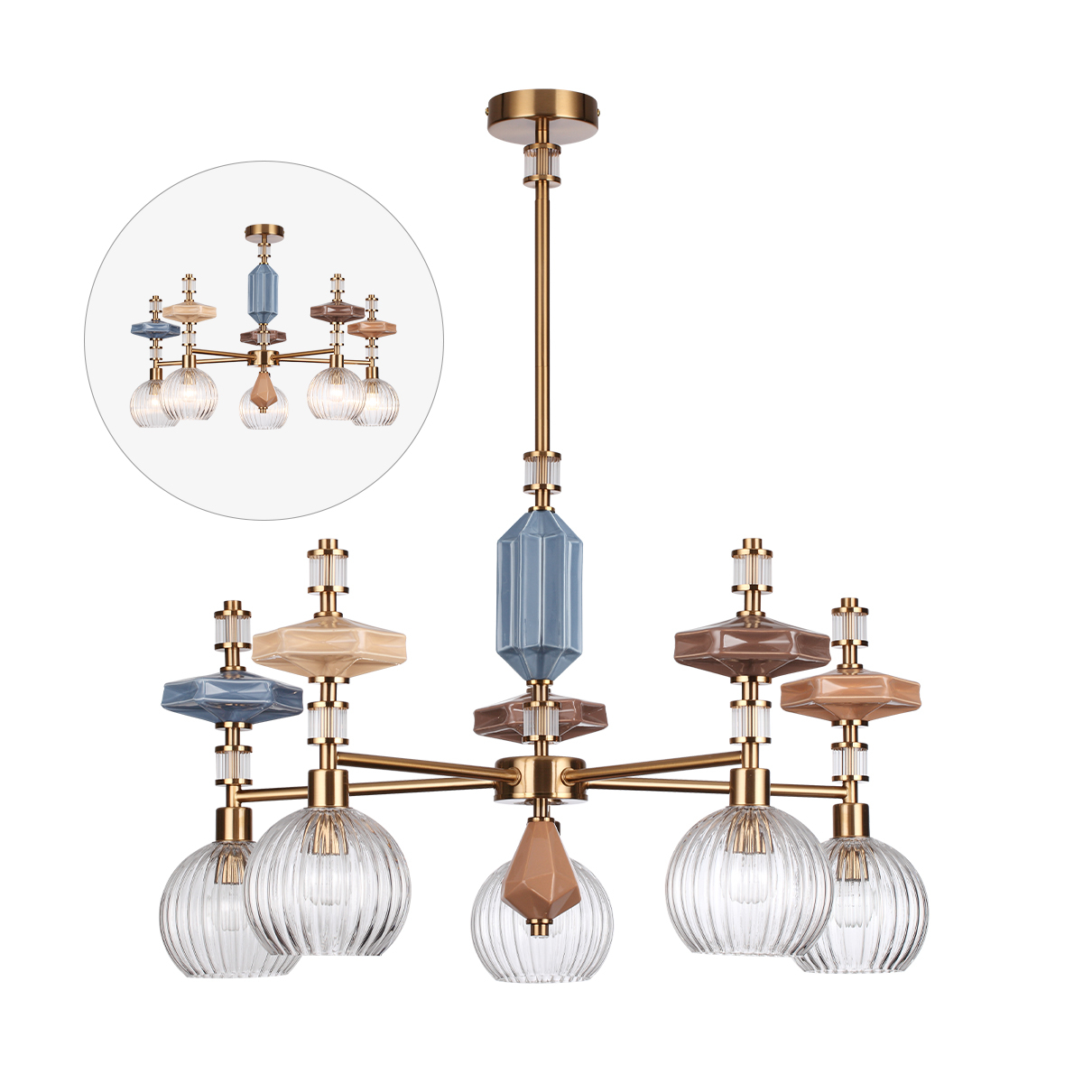 Коллекция TERRA сочетает в себе керамику ручной работы в трендовых оттенках бежевого, терракотового и кофейного цветов с добавлением акцентного пыльно-голубого цвета. Сложносоставной дизайн из укрупненных элементов различных геометрических форм ― наиболее трендовое направление в дизайне. Плафоны выполнены из стекла и имеют рифленую фактуру. Люстра имеет в комплекте два типа крепления: потолочное и на цепи.