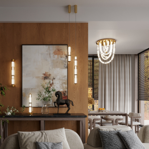 Форма коллекций Collier имитируют  образ колье, сверкающего многогранными элементами из стекла, металла и керамики. Линия выполнена в двух трендовых цветах: сатинированная латунь и сатинированный темный никель. Каскадный светильник линии Collier впишется в просторные интерьеры с высокими потолками и вторым светом.